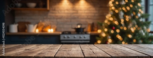 Festive kitchen backdrop with empty wooden table in foreground, Christmas tree and twinkling lights creating a warm, cozy atmosphere for holiday cooking and gatherings.