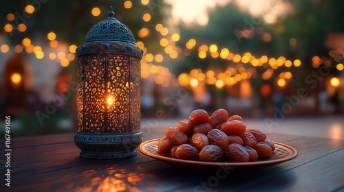 Festive lantern and plate of dates on wooden table with glowing bokeh background