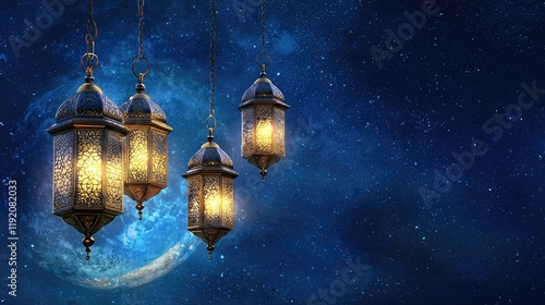 Festive lanterns illuminate night sky, full moon backdrop; Ramadan greeting