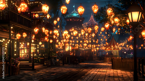 Festive Night Scene of Illuminated Buildings with Hanging Lanterns along a Cobblestone Street