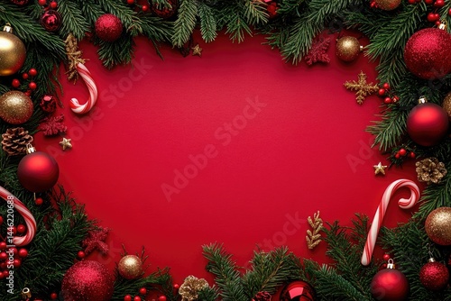 Festive on Red Ornaments, Pine Branches, and Candy Canes Border a Bright Backdrop