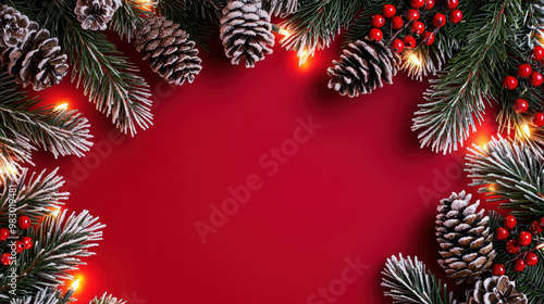 Festive pine branches adorned with frosted pinecones and vibrant red berries, framed against a rich red background