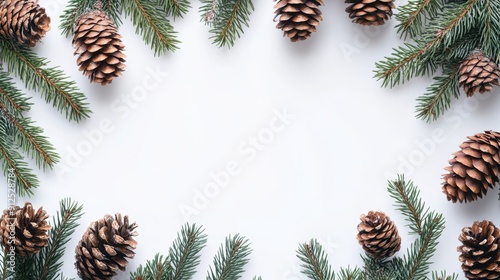 Festive Pine Cones and Fir Branches Frame on White Background