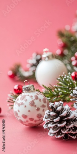 Festive red and white Christmas ornaments on snow-covered branches with pinecones and berries, set against a soft pink background