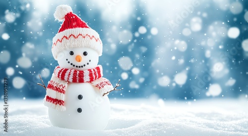 Festive Snowman Standing in Snowy Landscape with Falling Snowflakes