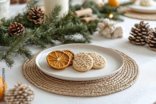 Festive table setting with homemade cookies, dried orange slices, pinecones, and greenery for a cozy winter gathering. Generative AI