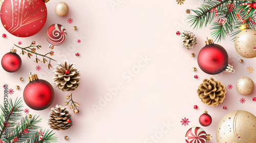 "Festive template with red and gold ornaments, pine cones, 'Merry Christmas' text, and space for event details."
