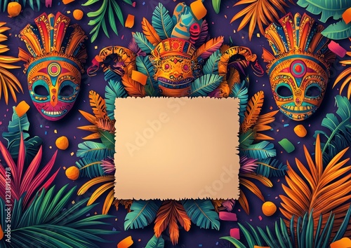 Festive tropical background with vibrant leaves, drums, masks, decorations, and a blank space for text on a dark backdrop Generative AI