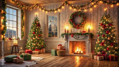 Festively decorated Christmas room with lights, garlands, and ornaments, Christmas, room decor, cozy, festive, holiday