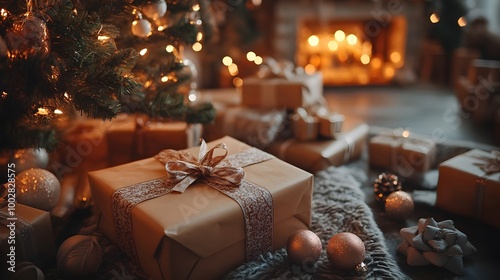 Festively Wrapped Presents and Holiday Surrounding a Glowing Christmas Tree in a Cozy Warm Setting