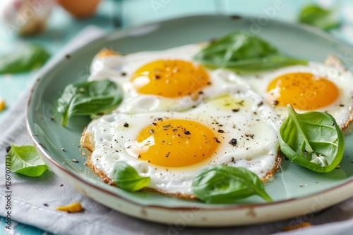 Few baked eggs over spinach in ceramic dish. Artificial intelligence image