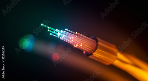 "Fiber optic cable glowing in macro. Abstract technology background for data and internet themes."