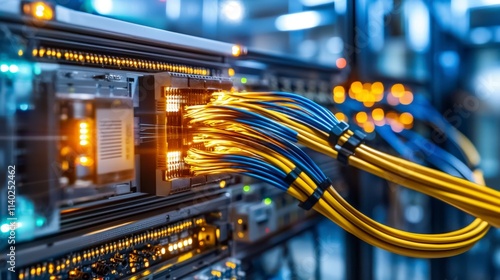 Fiber optic cables in data center technology infrastructure wired environment close-up view connectivity concept