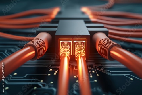 Fiber optic efficiency concept. A close-up of glowing orange cables connected to a black device, set against a dark circuit board background, showcasing modern technology and connectivity.