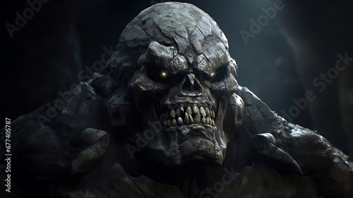 Fictional mythical evil stone golem with glowing eyes