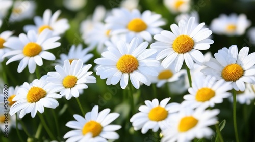 Field of daisies with white petals and yellow centers, creating a cheerful and bright atmosphere.