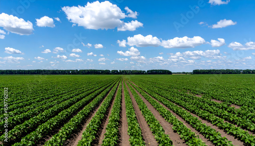 Field of green rows, A bird's-eye view of the lush rows of green plants under a bright blue sky.