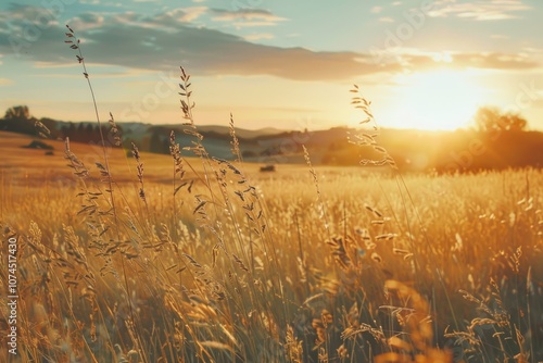 Field of tall grass with the warm glow of sunset in the background, suitable for rural or nature-themed projects