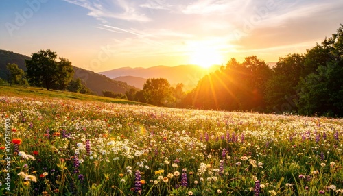 Field wildflowers, magical realm. Vibrant colors of sunset, sunrise