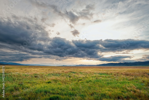 Fields and open spaces in the steppes of Tuva against the background of sunset clouds in autumn it is time to harvest cereals