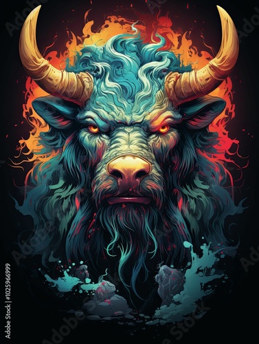 Fierce Blue Bull with Horns and a Beard Against a Fire Background