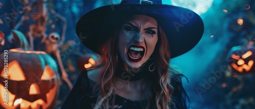 Fierce witch with fangs and red lipstick screams in a dark forest, surrounded by glowing jack-o'-lanterns, skeletons, and eerie blue lighting, creating a spooky Halloween vibe