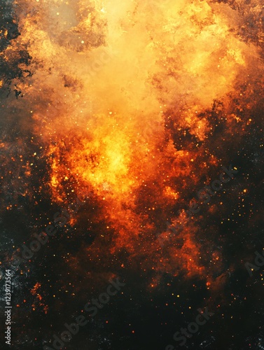 Fiery abstract artwork with intense orange and black textures creating a dramatic cosmic scene