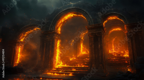 Fiery Ancient Stone Arches with Flaming Staircase at Dusk, Dramatic Atmosphere