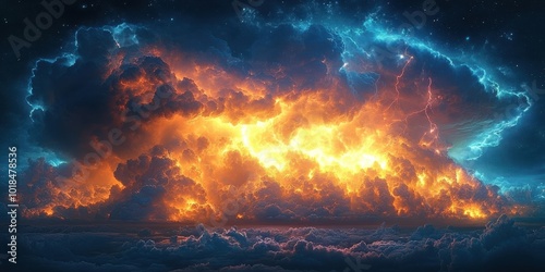 Fiery Clouds in the Night Sky, Illuminated by Lightning Bolts and a Starry Expanse