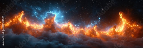 Fiery Cloudscape at Night Under a Starlit Sky: A Surreal and Dramatic Scene of Orange and Blue Flames