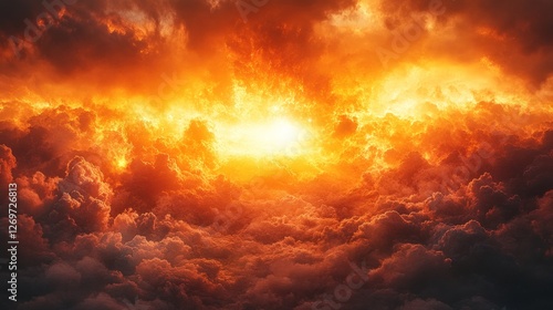 Fiery cloudscape with a brilliant light source emerging from a stormy sky.
