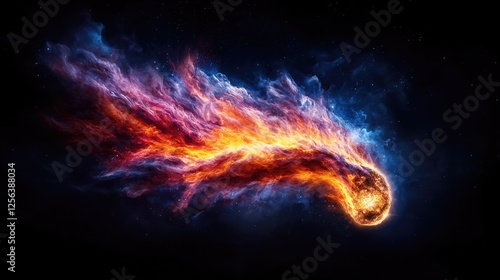 Fiery comet blazing across dark space; cosmic event