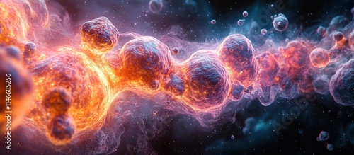 Fiery cosmic cluster of celestial bodies, glowing nebula.