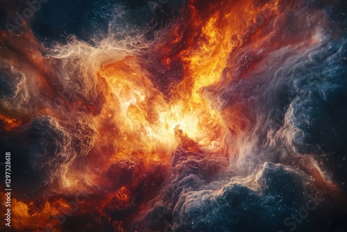 Fiery cosmic nebula with swirling orange and yellow flames in deep space