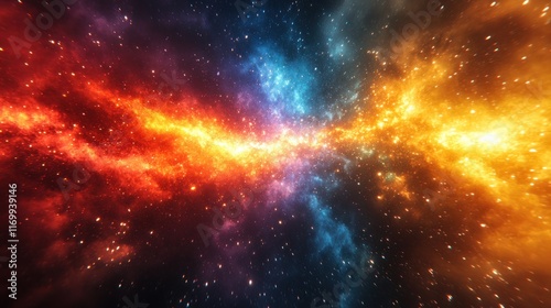 Fiery cosmic nebula with vibrant red and blue hues, depicting a celestial collision or energy burst in deep space.