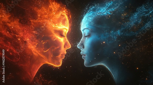 Fiery duality elemental faces of fire and ice cosmic realm digital art surreal environment close-up view