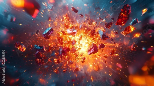 Fiery explosion debris, dark background, energy burst, abstract concept art
