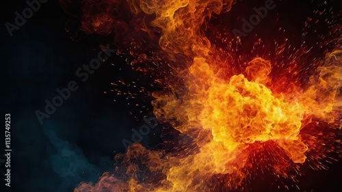 Fiery explosion with glowing flames and dark smoke swirling against a black background, creating a dramatic and intense scene