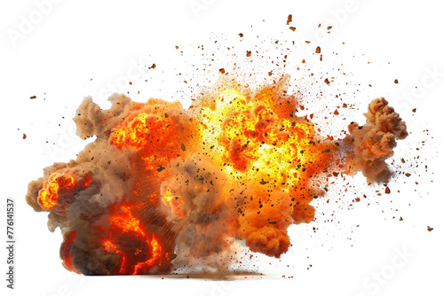 Fiery explosion with intense orange flames and debris isolated on transparent background