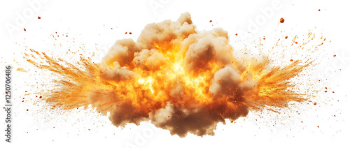 Fiery explosion with smoke and debris isolated on white background.