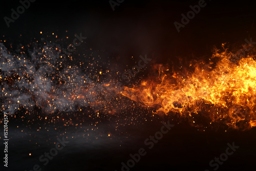 Fiery flame and smoke explosion with glowing sparks and dark background, illustrating intense heat and dynamic energy in vibrant orange and gray colors.