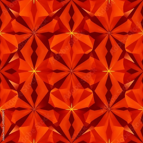 Fiery Geometric Kaleidoscope: Abstract seamless pattern of vibrant red and orange geometric shapes, creating a mesmerizing kaleidoscope effect. Ideal for backgrounds, textiles, and vibrant designs.