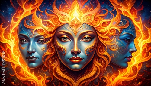 Fiery Goddess Trinity A mesmerizing digital painting of three celestial women engulfed in flames, their faces adorned with intricate, ornate designs against a cosmic backdrop.