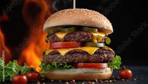 fiery hamburger on a dark background. Burger with paired buns, cutlets, lettuce, tomatoes, smoke, bokeh with spices. 10