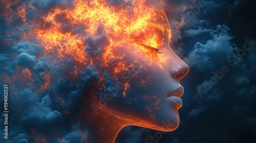 Fiery head portrait engulfed in dark clouds.