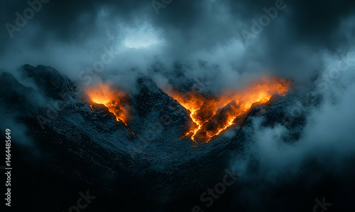 Fiery Mountain Peaks Enveloped in Dark Clouds