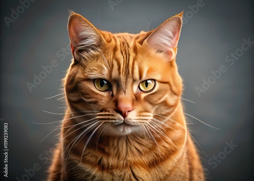 Fiery orange tabby stares intensely, a captivating feline portrait against a muted gray backdrop.