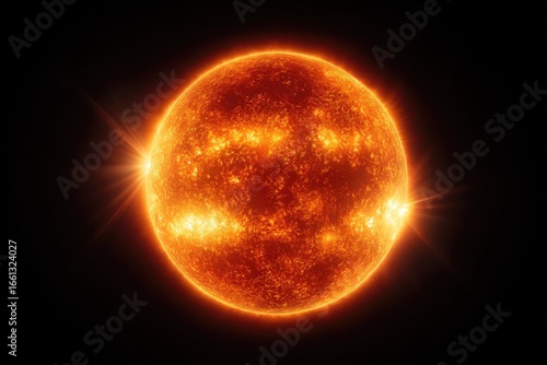 Fiery orb of the sun, blazing against a black void. Detailed surface texture, with bright flares