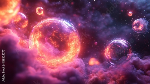 Fiery orbs float amidst swirling purple nebula clouds