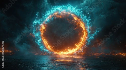 Fiery portal circle of fire and energy with dark ground and cloudy background